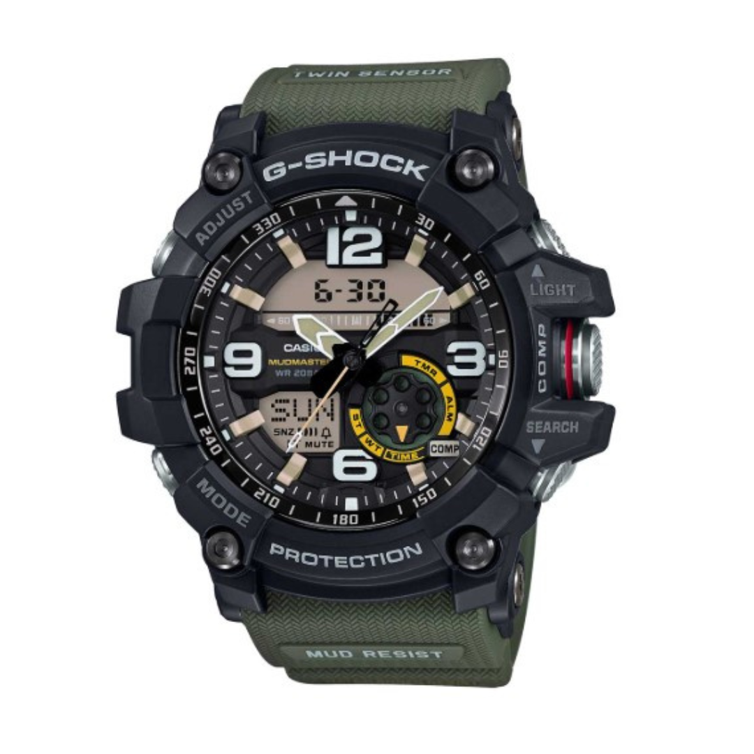 שעון יד ג'י-שוק דגם GG-1000-1A3 מסדרת MUDMASTER המובילה של G-SHOCK – תוכנן במיוחד לעמידה בתנאי שטח קיצוניים. משלב תצוגה אנלוגית ודיגיטלית, כולל מצפן, מד טמפרטורה, עמידות למים עד 200 מטר ועמידות גבוהה לזעזועים, בוץ ולכלוך. אידיאלי לחיילים, מטיילים ואנשי שטח מקצועיים.